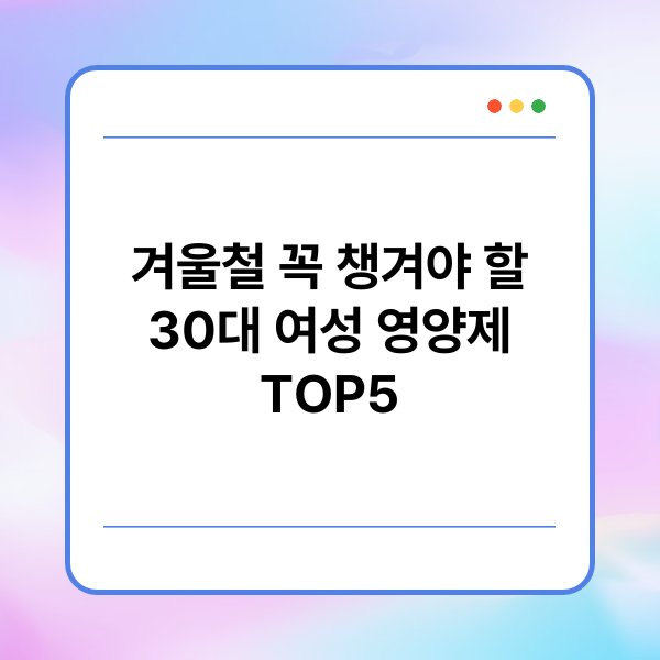 겨울철은 기온이 낮아지고 면역력이 떨어지는 시기로, 특히 30대 여성들은 건강 관리에 더욱 신경 써야 하는 시기입니다. 이 시기에 적절한 영양제를 섭취하는 것은 면역력 증진과 건강 유지에 큰 도움이 됩니다. 본 글에서는 겨울철 꼭 챙겨야 할 30대 여성 영양제 TOP5를 소개합니다. 각 영양제의 효능과 추천 이유를 자세히 살펴보겠습니다. 이를 통해 겨울철 건강 관리를 위한 참고자료로 활용할 수 있습니다.